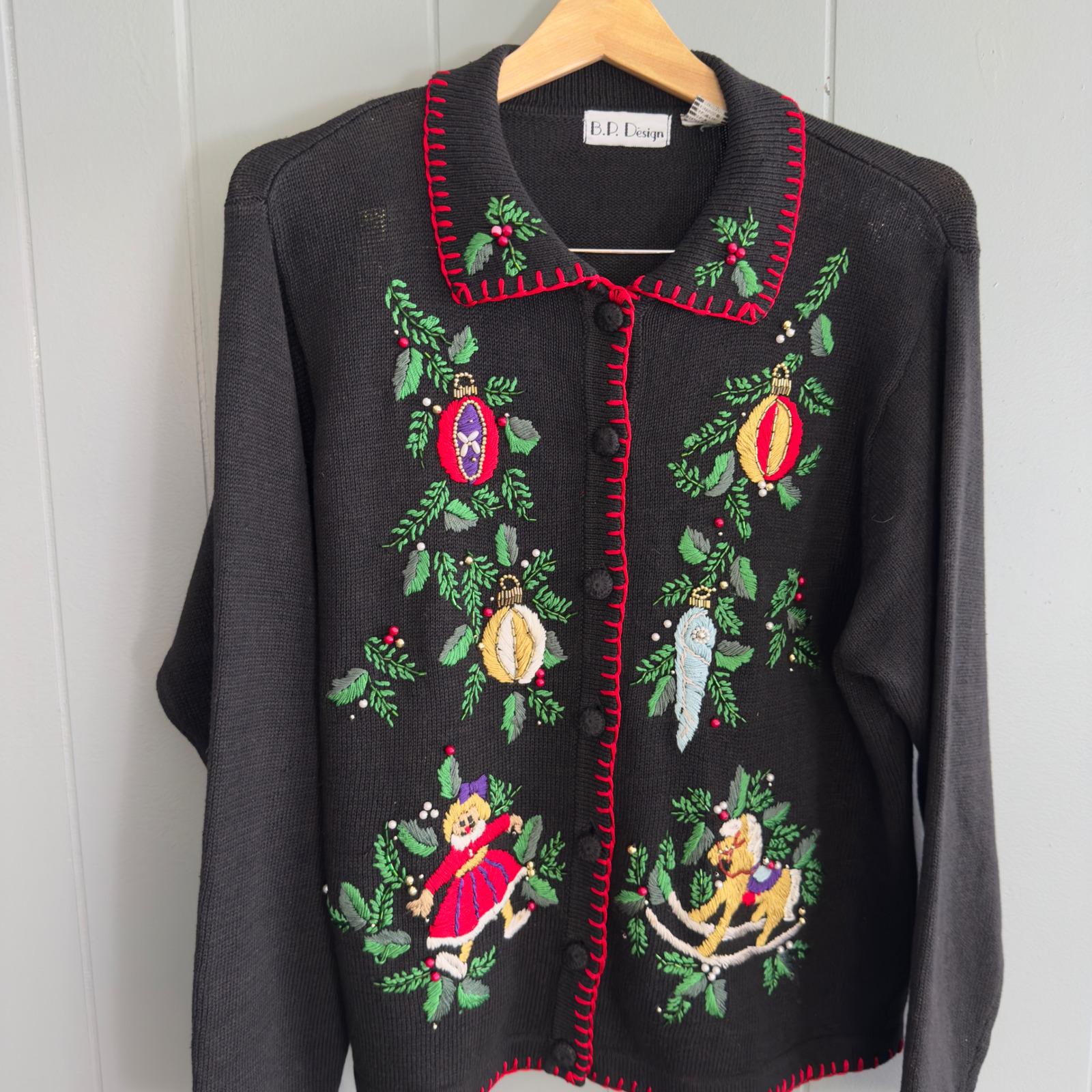 Be the first to review “VTG B.P. Design Christmas sweater L embroidered toys ornaments beaded cardigan”