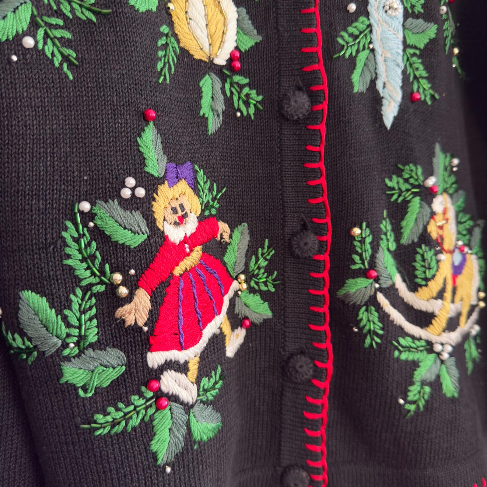 VTG B.P. Design Christmas sweater L embroidered toys ornaments beaded cardigan